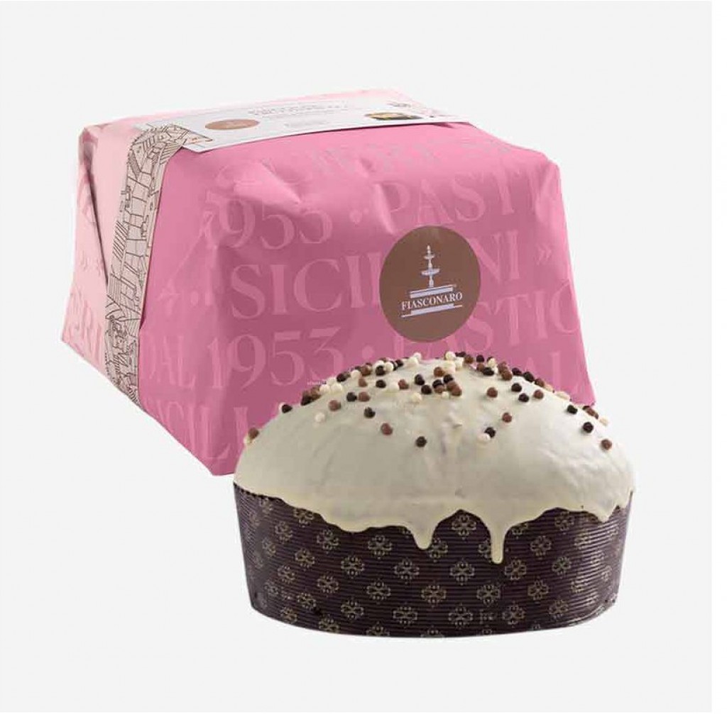 Panettone ai Frutti Bosco (semicanditi) con glassa al cioccolato bianco e croccanti cereali di cioccolato, un dolce artigianale fresco e profumato prodotto in Sicilia da Fiasconaro.